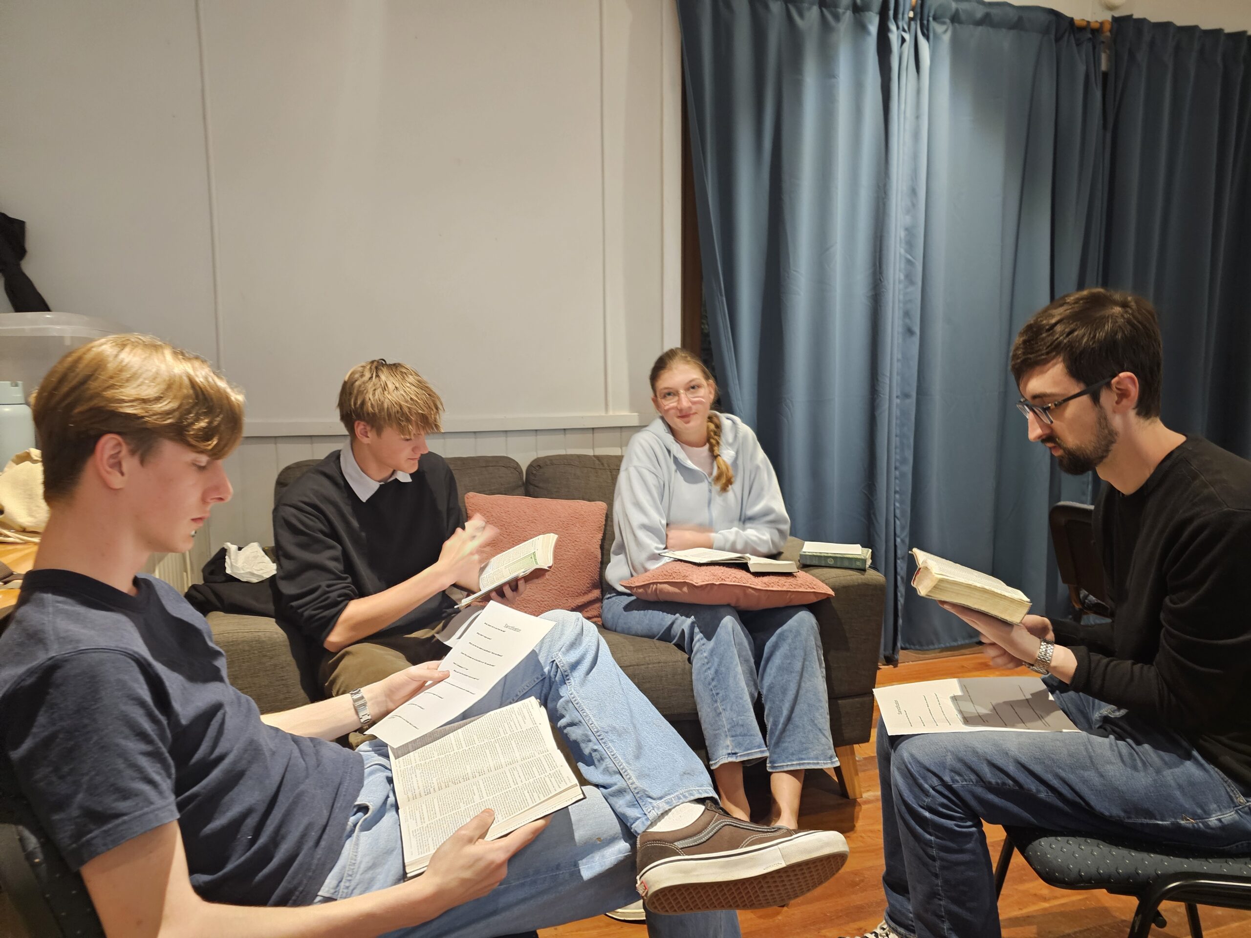 We meet for Youth Bible Study every Sunday at the same time as the sermon during our morning service at 9.30am. The format is pretty simple: we intend to have a bunch of fun, hang out and spend some time thinking and chatting through the relevance of what the Bible says about God, us and the world we live in.